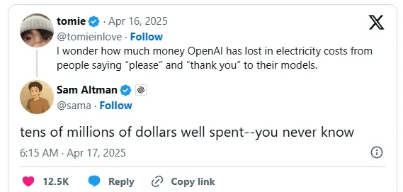 Sam Altman, Giám đốc điều hành OpenAI, cho biết mỗi lần người dùng nói “cảm ơn ChatGPT”, hệ thống lại phải tiêu tốn một khoản chi phí xử lý. Ngày 16/4, một tài khoản trên X mang tên @tomiinlove...