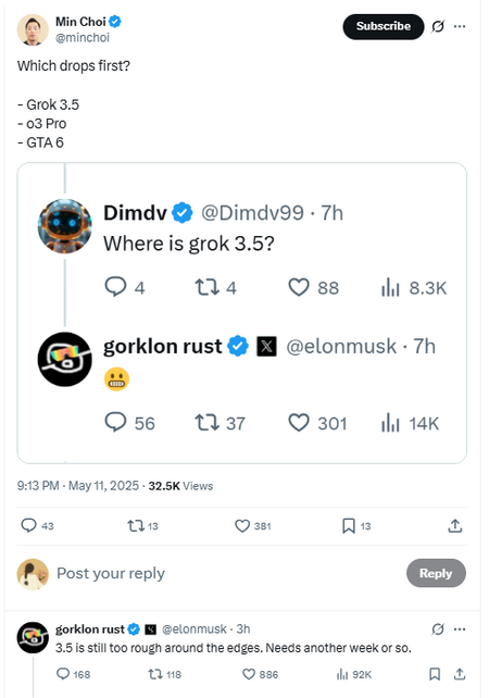Một số cư dân mạng X gần đây đã hỏi, "Cái nào sẽ được phát hành trước, Grok 3.5, GPT-o3 Pro và GTA 6?". Đáp lại, tài khoản X của Elon Musk trả lời: "3.5 vẫn hơi quá thô. Sẽ mất thêm một tuần nữa...