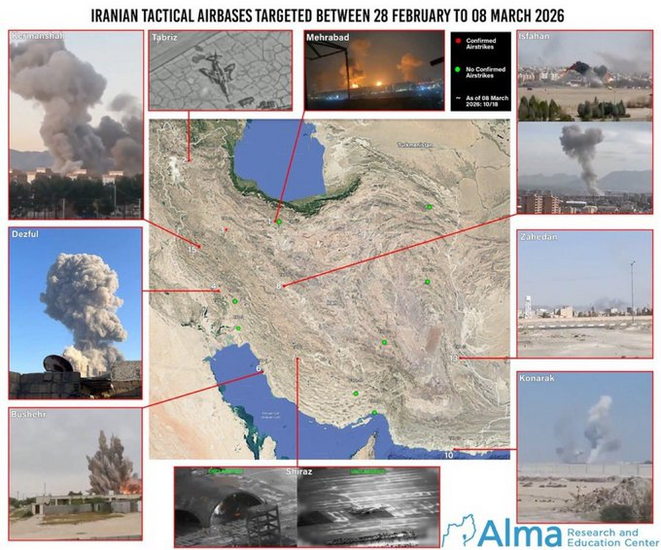 Israel tuyên bố các cuộc tấn công đã nhắm vào 10 trong số 18 căn cứ không quân chính của Iran, phá hủy máy bay chiến đấu, máy bay vận tải, hệ thống radar và đường băng trên khắp cả nước: