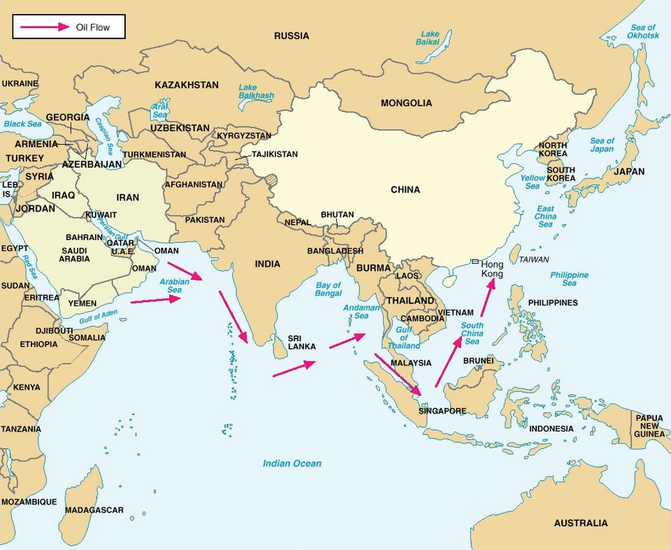 Bản đồ luồng năng lượng đi từ Vịnh Ba Tư và Vịnh Aden ở Trung Đông: