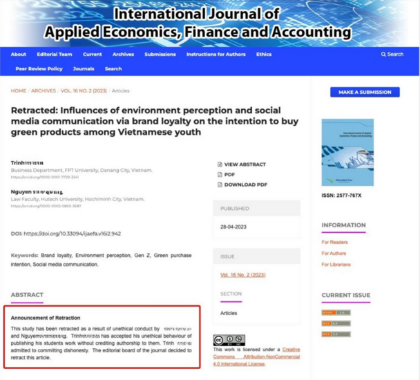 Theo thông báo chính thức từ International Journal of Applied Economics, Finance and Accounting (IJAEFA), một bài báo khoa học công bố năm 2023 do hai tác giả Việt Nam thực hiện đã bị gỡ khỏi hệ...
