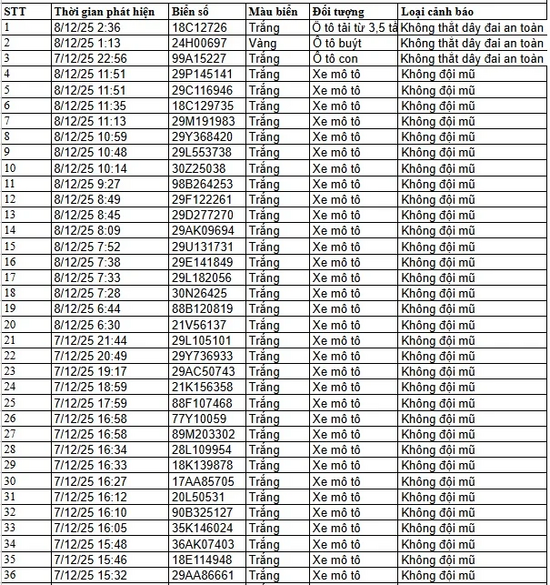 Cục CSGT cho biết, trong khoảng thời gian từ 12 giờ ngày 7/12 đến 12 giờ ngày 8/12, hệ thống camera AI lắp đặt trên tuyến cao tốc Nội Bài – Lào Cai và tại một số khu vực nội đô Hà Nội đã ghi nhận...