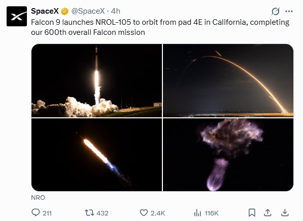 SpaceX đã phóng thành công NROL-105 vào tối ngày 16/1/2026 theo giờ địa phương, đánh dấu sứ mệnh thứ 600 của dòng tên lửa Falcon. Đây là sứ mệnh phóng thứ bảy của SpaceX trong năm 2026 và là sứ...